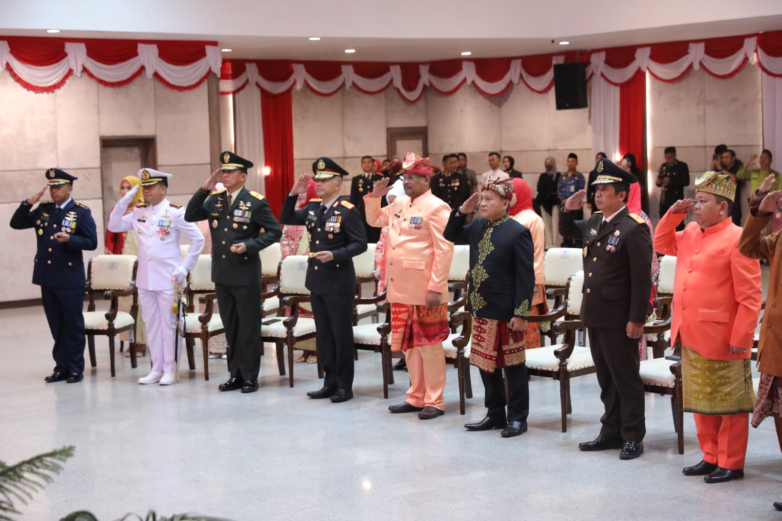 Mengenakan busana adat melayu, Pj Gubernur Safrizal nampak khidmat mengikuti jalannya Upacara Detik- Detik Proklamasi Kemerdekaan RI yang ditayangkan secara serentak mulai pukul 10.00 WIB atau 11.00 WITA daerah setempat.