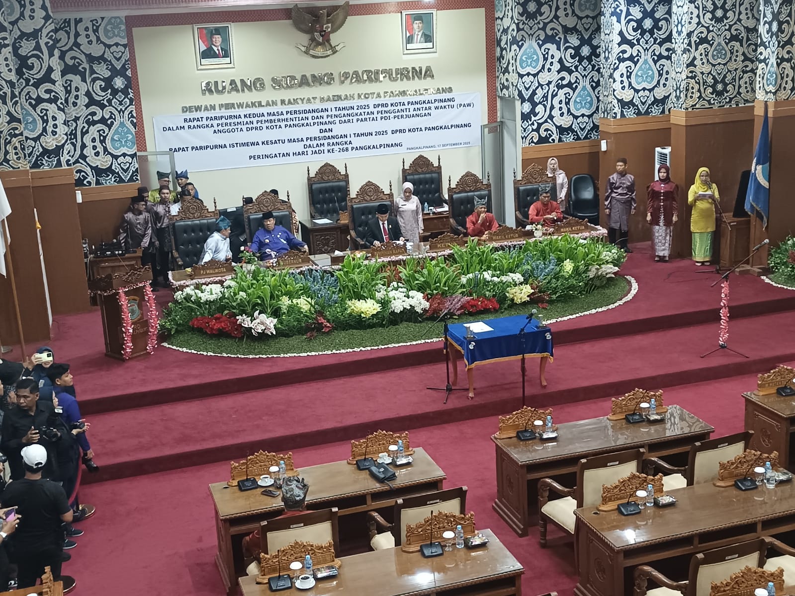 ZHIENEWS.COM, PANGKALPINANG – Penjabat (Pj) Wali Kota Pangkalpinang, M. Unu Ibnudin menghadiri Rapat Paripurna peringati Hari Jadi ke-268 Kota Pangkalpinang sekaligus agenda peresmian pemberhentian dan pengangkatan Pengganti Antar Waktu (PAW) anggota DPRD dari Partai Demokrasi Indonesia Perjuangan (PDIP), yang digelar di ruang Rapat Paripurna DPRD Pangkalpinang, Rabu (17/9/2025).