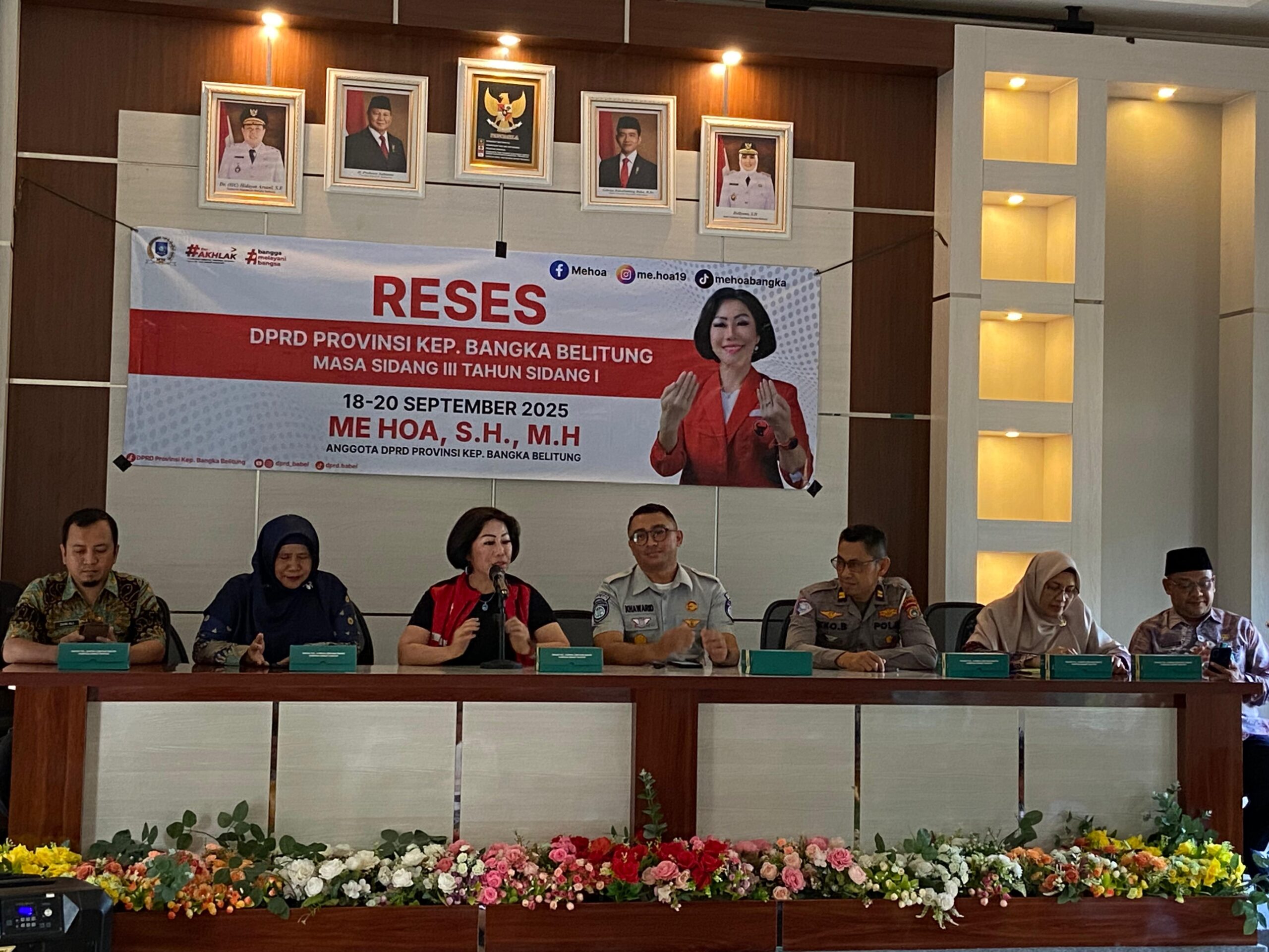 ZHIENEWS.COM, PANGKALANBARU – Wakil Ketua Komisi IV DPRD Provinsi Kepulauan Bangka Belitung (Babel) dari Daerah Pemilihan (Dapil) Bangka Tengah, Me Hoa menggelar kegiatan reses di SMKN 1 Pangkalanbaru, Kabupaten Bangka Tengah, Kamis (18/9/2025).