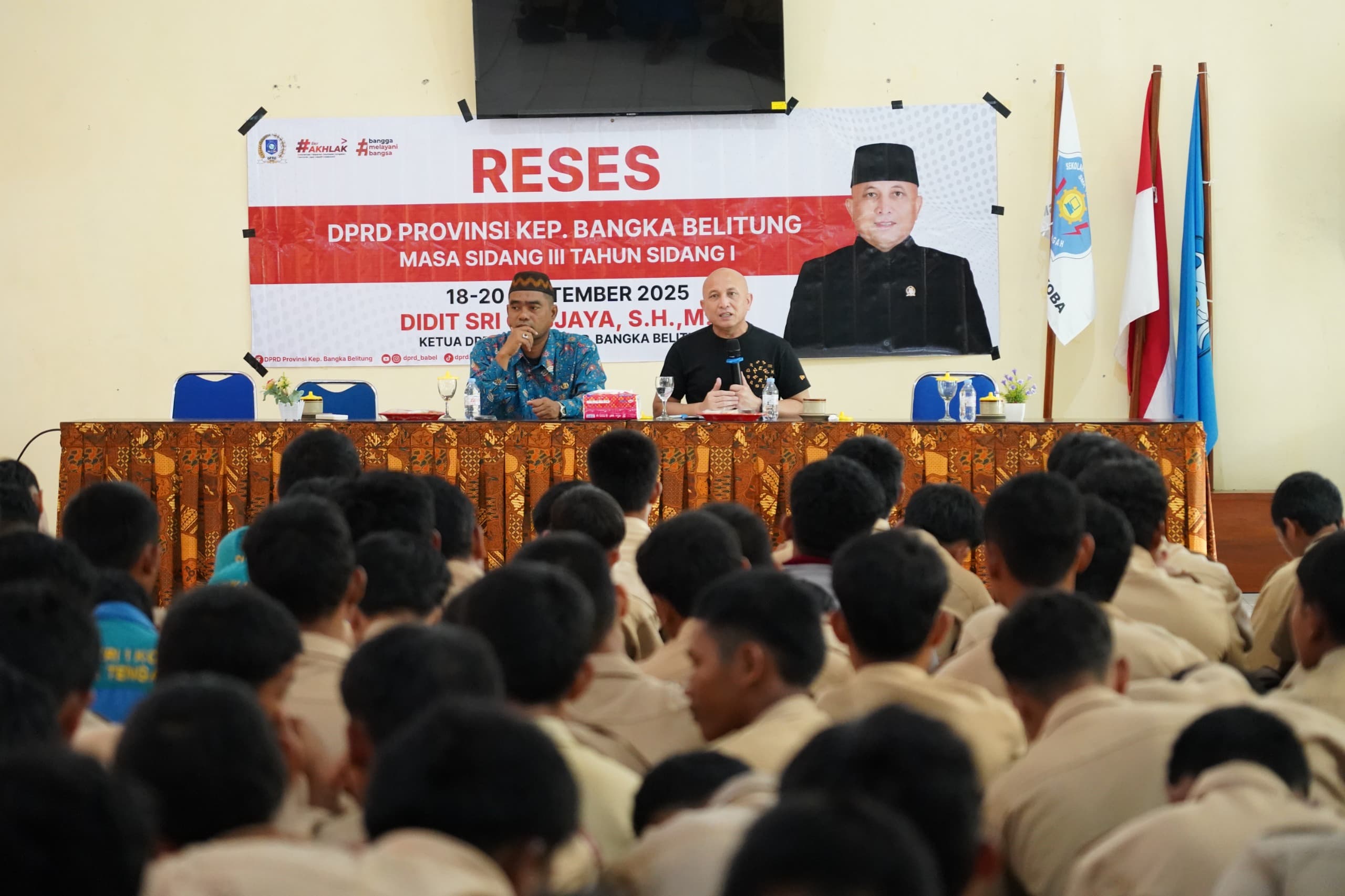 ZHIENEWS.COM, KOBA – Ketua DPRD Provinsi Kepulauan Bangka Belitung (Babel), Didit Srigusjaya melaksanakan kegiatan Reses Masa Sidang III Tahun Sidang I di SMK Negeri 1 Koba, Kamis (18/9/2025). Dalam kunjungan tersebut, Didit menyerap aspirasi pihak sekolah terkait kebutuhan sarana dan prasarana, hingga pembiayaan penunjang pendidikan.